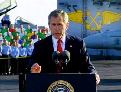 暗藏玄機(jī)之四,布什政府未來行動之四:布什乘戰(zhàn)機(jī)上航母做演講這一系列動作顯然還有明顯的國內(nèi)政治意圖。美國《紐約時報》聲稱,讓布什上航母演講除了是撈最大程序的政治影響之外,沒有其它的解釋。布什總統(tǒng)被充滿笑臉的美國大兵包圍的情景顯然是2004年競選連任最佳的布景!(聞新芳)