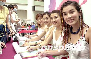 “2003年度香港小姐競(jìng)選”5月10日在香港奧海城商場(chǎng)舉行簽名活動(dòng)。應(yīng)屆港姐冠軍林敏俐(右二)、亞軍左慧琪(右一)、季軍胡家惠(左一)等出席簽名宣傳活動(dòng)。鄧慶樂 攝