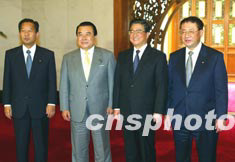 胡錦濤今天在人民大會(huì)堂會(huì)見了日本自民黨干事長(zhǎng)山崎拓、公明黨干事長(zhǎng)冬柴鐵三和保守新黨干事長(zhǎng)二階俊博。