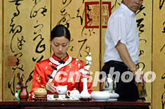 六月十五日,北京一家商場(chǎng)在門口表演茶道,在父親節(jié)的周末促銷新到的茶葉品種。中新社記者 盛佳鵬 攝