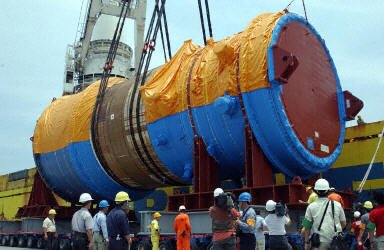 據(jù)“中央社”報道,“核四”反應爐壓力容器主體及配件共32件數(shù)日前運抵基隆港靠岸,原預定17日凌晨卸載,由于天公不作美、海象不佳,在港口等待數(shù)日。該反應爐重達107噸,長24米、寬9米、長10米,是個超級巨無霸,從日本運抵臺灣,只有荷蘭籍巴卡尼號全球唯一足夠噸位的重件船,可以載得動。
