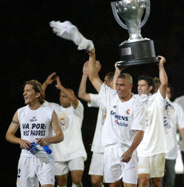皇家馬德里隊必須贏得這場比賽才能確保贏得聯(lián)賽冠軍,為此全部精英首發(fā)上場,迎戰(zhàn)畢爾巴鄂隊!巴庑侨恕绷_納爾多當(dāng)天還特意理了一個在去年世界杯賽期間理過的發(fā)式參賽,并在這場比賽中發(fā)揮得淋漓盡致,一人獨中兩元,為皇家馬德里隊奪取冠軍立下汗馬功勞。開場僅9分鐘,羅納爾多近射得手,使得皇家馬德里隊以1:0領(lǐng)先。第三十六分鐘時,畢爾巴鄂隊的阿爾基薩攻進一球,將比分扳成1:1平。上半場快結(jié)束時,巴西球星卡洛斯門前主罰任意球,將球直接踢進對方的球門。第六十一分鐘,羅納爾多錦上添花,將比分鎖定為3:1。