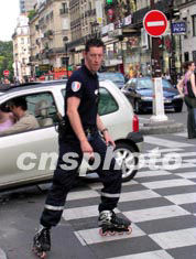 2003年6月的法國巴黎,天氣晴朗,一名警察腳踏排輪穿梭街道巡邏,以快速應變狀態(tài)對付罪案發(fā)生。盧峰 攝