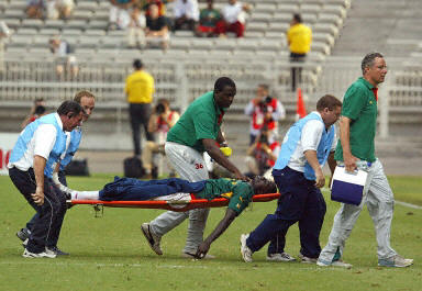 喀麥隆隊(duì)?wèi){借前鋒恩迪埃菲在上半場(chǎng)第九分鐘攻進(jìn)的一球,在里昂以1比0淘汰了哥倫比亞隊(duì),也躋身決賽。但比賽進(jìn)行到第七十二分鐘時(shí),喀麥隆中場(chǎng)球員馬克-維維安·福突然自己在中場(chǎng)倒地,不省人事,被立即抬出場(chǎng)地后經(jīng)搶救無(wú)效死亡。