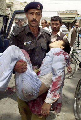 巴基斯坦西南部城市基達的一個什葉派穆斯林的清真寺內(nèi)4日發(fā)生自殺爆炸事件,至少15人死亡,數(shù)十人受傷。圖為巴基斯坦警察正在運送受傷人員。