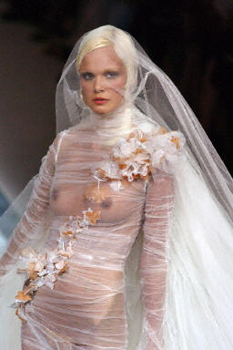 7月9日在巴黎2003/04秋冬時尚女裝時裝周上,一位模特現(xiàn)場展示了Jean-Paul Gaultier設計的性感透明婚紗。