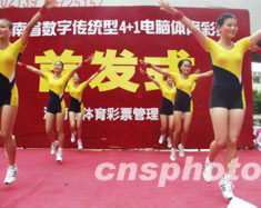 七月十二日,海南省率先在全國推出“四加一”體育彩票新玩法。在海口金世紀廣場舉行的首發(fā)儀式上,模特跳舞表演助興。作者:王辛莉