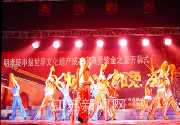 這臺晚會7點30分由大型舞蹈“盛世年華”開場,“梅花三弄”、“龍的傳人”、“陽光征程”等歌舞,逐漸把晚會推向高潮。9點整,2600個組合的煙火禮花齊聲鳴放,把玄武湖畔、紫金山麓映照得萬紫千紅,整個過程一直持續(xù)1小時,這是南京歷史上燃放煙火規(guī)模最大的一次;盍λ纳涞奈枳耍宀世_紛的焰火,熱辣涌動的人群,組成一個激情流火的仲夏夜。