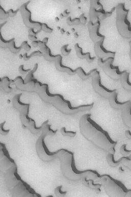 7月13日,來自美國國家航空和宇航局(NASA)的火星全球測量員(MGS)和火星衛(wèi)星照相機(MOC)的圖片顯示,火星北極冰冠附近的沙丘。冰冠被大片受風吹蝕的黑暗沙丘包圍。