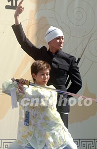 香港巨星劉德華、武術(shù)名家李暉,七月十九日在香港舉行的“諾基亞6108揮筆舞劍創(chuàng)記錄”慈善活動(dòng)上,率五百人寫書法及耍太極劍齊創(chuàng)健力士記錄。中新社記者:錢興強(qiáng)