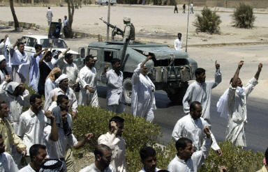 示威者在納杰夫市內(nèi)一主要清真寺門前集合,步行到由美國(guó)海軍陸戰(zhàn)隊(duì)把守的市政廳門前,并高呼“不要美國(guó)”等口號(hào)。有些憤怒的伊拉克人還向美國(guó)士兵投擲石塊,美軍沒有開槍還擊。