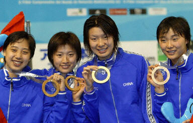 27日,中國游泳隊在巴塞羅那世界游泳錦標(biāo)賽,奪得了女子四乘一百米混合泳接力賽的冠軍,中國姑娘還以三分五十九秒八九的成績打破了世錦賽的賽會紀(jì)錄,并且如愿拿到了這枚份量最重的金牌。(圖左起)戰(zhàn)殊、羅雪娟、周雅菲和楊雨登上領(lǐng)獎臺。
