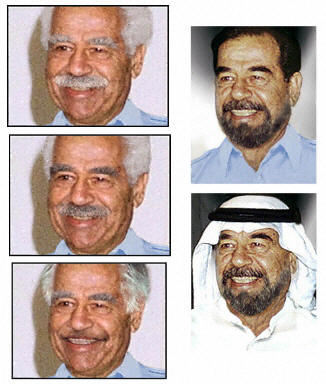 據(jù)路透社報道,這些照片包括通常蓄髭且深發(fā)的薩達姆若留胡須、把臉刮干凈、白發(fā)或灰發(fā)的模樣,還有一張為他戴著傳統(tǒng)阿拉伯頭巾的樣子。這些照片都已經(jīng)發(fā)給正在伊拉克全力搜索薩達姆的軍隊。