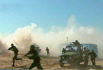 在首先進行的城鎮(zhèn)清剿、解救人質的實兵演習中,面對襲擊城鎮(zhèn)、劫持中外人質的武裝恐怖分子,聯(lián)合指揮部指揮反恐特戰(zhàn)分隊、陸軍航空兵和武警特種分隊,分四路對發(fā)生恐怖暴力事件的城鎮(zhèn)實施合圍,開展拉網式清剿。當恐怖分子退縮到一棟樓時,突擊隊員對恐怖分子展開攻擊,另一隊突擊隊員也乘直升機抵達現(xiàn)場。經過激戰(zhàn),成功解救了被劫人質。