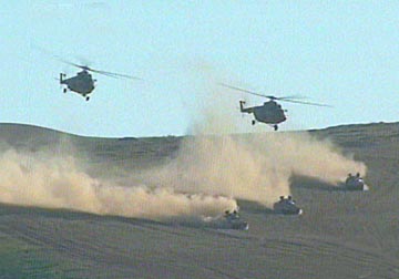 在攻打恐怖分子營地、圍殲恐怖分子的實兵實彈演習中,參演的聯(lián)合部隊800多人對邊境地區(qū)的恐怖分子營地展開了強大的攻勢?罩兄鄙龣C盤旋攻擊,地面坦克、裝甲車和步兵從左、中、右三路對恐怖分子實施圍剿,遠方炮兵強大的火力摧毀恐怖分子營地內的堡壘,壓制著恐怖分子的火力,不時有導彈呼嘯而過,準確地擊中恐怖分子的指揮地點。特種反恐分隊在模擬國境線上空降,截斷恐怖分子的越境逃逸之路。