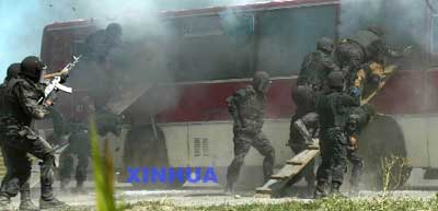 中國特戰(zhàn)隊(duì)員在依托步戰(zhàn)車進(jìn)行反恐演練。在擔(dān)負(fù)“城鎮(zhèn)清剿,解救人質(zhì)”的參演部隊(duì)中,還有一支由100多名指揮官和士兵組成的反恐分隊(duì)。這支分隊(duì)從組建至今,曾多次為外軍領(lǐng)導(dǎo)做過摩托車特技、飛車抓捕、攀登、戰(zhàn)術(shù)課目等軍事表演,受到了外軍領(lǐng)導(dǎo)人的高度評價(jià)。據(jù)介紹,在正式演習(xí)之前,這支反恐特戰(zhàn)分隊(duì)的隊(duì)員們每天都定下一個目標(biāo),利用臨睡之前的半個小時進(jìn)行演練。隊(duì)長薛峰每天都與戰(zhàn)士們汗流浹背地在野外山地苦練,一個動作,一招一式,絲毫也不馬虎。這支部隊(duì)的負(fù)責(zé)人曹鴻建說,反恐作戰(zhàn)不能沿用傳統(tǒng)的思維方式和戰(zhàn)法,為了應(yīng)付不同環(huán)境、不同條件下的突發(fā)事件,他們長年進(jìn)行高強(qiáng)度、高難度的全面錘煉,目前,官兵們已全部進(jìn)入臨演狀態(tài),有信心完成這次多國聯(lián)合演習(xí)中的任務(wù)。