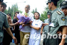 中國最后兩名非典病人孫錚(中)和盧志艷(左一),八月十六日上午于北京地壇醫(yī)院康復(fù)出院,并向醫(yī)護(hù)工作者告別。中新社記者:鄒憲