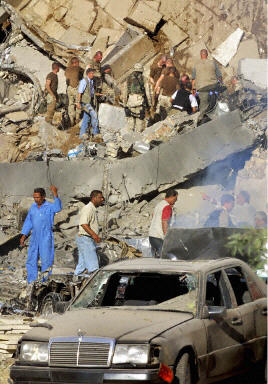 聯(lián)合國雇員告訴?怂剐侣劊òl(fā)生時大樓里至少還有150名工作人員。福克斯新聞記者丹-斯普林杰自現(xiàn)場發(fā)回的報道稱,兩層高的“運河賓館”有整整一個角被炸掉!據(jù)稱,爆炸的中心位置好象位于賓館的大廳。(章田)