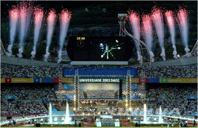 據(jù)新華網(wǎng)消息,繼北京成功舉辦第二十一屆世界大學(xué)生運(yùn)動(dòng)會(huì),國際大體聯(lián)在新世紀(jì)之初第二次選擇了亞洲。經(jīng)過兩年不懈的努力,只有200多萬人口的大邱將一幅精心繪制的青春畫卷展現(xiàn)在了來賓面前。韓國總統(tǒng)盧武鉉21日晚在這里宣布大運(yùn)會(huì)開幕,標(biāo)志著亞洲體育走向世界的步伐正在加快,而世界對(duì)亞洲的認(rèn)同也正趨于一致。
