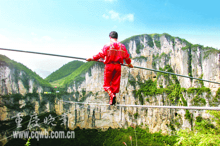 這次走鋼絲離地面絕對高度達(dá)到了六百多米,打破了由美籍加拿大人杰伊-科克倫和他本人在一九九七年于三峽夔門創(chuàng)造的高空行走高度的世界紀(jì)錄,前兩次鋼絲距地面高度僅為三百米。