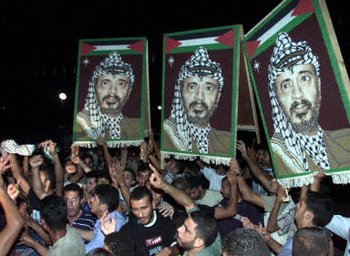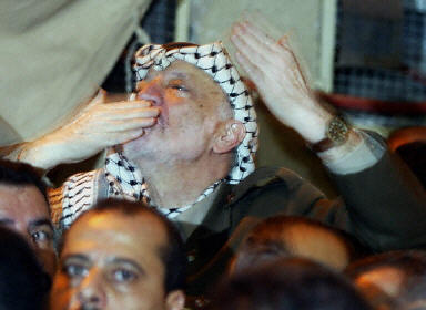 就在以色列做出上述決定的同時,阿拉法特依然受到數(shù)千支持者的擁戴,當(dāng)他在周三走出辦公總部時無數(shù)的支持者在向他歡呼。身旁有保鏢保護的阿拉法特向支持者拋去飛吻,并做出勝利的姿式。在加沙城市中心,5000多人走上街頭進行游行表達對阿拉法特的支持。(春風(fēng))
