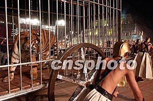 超大型景觀歌劇《阿依達》九月二十五日晚在北京工人體育場搭建的世界最大舞臺上進行實況彩排。該劇場面鋪排、氣勢恢弘。圖為由象、獅、虎等動物組成的車隊浩浩蕩蕩地上場。中新社記者:張煒