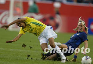 美國(guó)當(dāng)?shù)貢r(shí)間10月1日,女足世界杯兩場(chǎng)四分之一比賽在美國(guó)東海岸的波士頓市吉列體育場(chǎng)舉行,瑞典隊(duì)(藍(lán))以2比1擊敗巴西隊(duì)率先殺入四強(qiáng)。作者:劉占坤