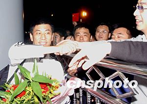 十月四日晚,剛剛抵達(dá)北京的中國(guó)女子足球隊(duì)主教練馬良行在首都國(guó)際機(jī)場(chǎng)受到球迷們的熱烈歡迎,中國(guó)女足雖然沒有完成進(jìn)軍前四的預(yù)定任務(wù),但她們?cè)趫?chǎng)上的拼搏精神依然得到球迷的認(rèn)可。中新社記者:武仲林