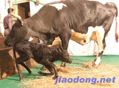 今天凌晨,記者和科研人員一起,焦急地等待“蓓蓓”的降生。3時18分,在科研人員的努力下,克隆牛“蓓蓓”終于來到了這個世界,母親黑白花奶!袄婊ā弊o犢情深,忽然發(fā)起牛威,不許眾人靠近,并用舌頭舔干“蓓蓓”的濕濕的黑色毛皮!拜磔怼遍_始睜開眼睛,怯生生地看著四周關(guān)心它安危的人們。凌晨4點左右,在母親的幫助和周圍人們的鼓勵下,“蓓蓓”終于顫悠悠的站了起來,并在母親的幫助下開始行走?蒲腥藛T費了好大的勁才遏制住了母親的牛勁,開始對剛降生的“蓓蓓”進行科學(xué)測量。經(jīng)測量,“蓓蓓”體長66厘米,身高78厘米,胸圍81厘米,管圍11厘米,心律188次/分,體溫39攝氏度,體重33公斤,各項生理指標正常。