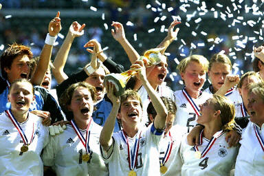 北京時(shí)間今天凌晨3時(shí)許結(jié)束的第四屆女足世界杯決賽中,德國隊(duì)與瑞典隊(duì)在90分鐘的比賽中戰(zhàn)成了1-1平。在加時(shí)賽中,德國隊(duì)?wèi){借著后衛(wèi)金策爾的一粒金球讓瑞典隊(duì)飲恨美利堅(jiān),他們也因此成為該項(xiàng)賽事的新科狀元。德國隊(duì)頭號(hào)射手普林茨奪取了金靴獎(jiǎng)和金球獎(jiǎng)兩項(xiàng)大獎(jiǎng)。圖為德國隊(duì)員棒杯歡呼。