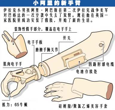 新的手臂是在倫敦的瑪麗女王學(xué)院安裝的,手術(shù)費(fèi)用由科威特政府支付。阿里的左臂只能起到美容的目的,因?yàn)樗瓉?lái)的左臂幾乎被全部炸掉了。他的右臂假肢則由電極操縱其剩下來(lái)的手臂肌肉。