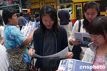 香港市民爭看號外!吧裰邸蔽逄栵w船十月十五日順利升空,香港傳媒特發(fā)號外,圖為香港市民在街頭爭看號外。中新社記者:錢興強