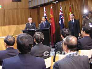 中國(guó)國(guó)家主席胡錦濤和澳大利亞總理霍華德10月24日在聯(lián)邦大廈聯(lián)合會(huì)見(jiàn)中澳記者。中新社記者 劉雨生 攝