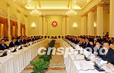 十月二十七日,滬港經(jīng)貿(mào)合作會(huì)議在香港禮賓府舉行,圖為上海市市長(zhǎng)韓正(中)、上海市副市長(zhǎng)周禹鵬(右)等上海高官出席該會(huì)議。中新社記者:潘索菲