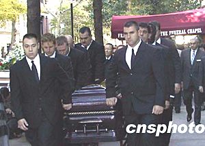 “中央社”報道說,十位工作人員將古銅色的棺木抬上靈車,由兩部警車開道,靈車和十余部家屬乘坐的禮車緩步前行。