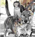 調(diào)皮搗蛋的“嘟嘟”,經(jīng)常跳上體型大它數(shù)倍的土狗身上,土狗“虎斑”更是放任小猴子在身上跳來跳去,附近村民紛紛露出驚奇神情,覺得不可思議。