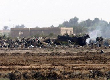 駐伊美軍發(fā)言人說,目前已證實(shí)2日在巴格達(dá)附近被擊落的美軍運(yùn)輸直升機(jī)造成13人死亡,至少20人受傷。圖為墜落在費(fèi)盧杰的美軍用直升機(jī)失事現(xiàn)場(chǎng)。