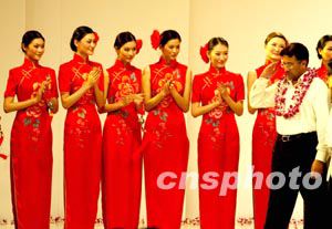圖為觀看表演的巴基斯坦總統(tǒng)穆沙拉夫?yàn)樯泶┐蠹t旗袍的佳麗們敬禮喝采。