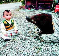 據臺灣聯合報報道,萬興村的萬墩巷成了”山豬巷”,居民閑暇不是聊山豬就是溜山豬,張勝雄家名叫”小豬”的山豬頗有個性,5個月大,不論睡覺或玩耍都要蓋被子。張?zhí)f,小豬的習性很奇特,親戚朋友聽到了還跑來一觀究竟,看到山豬躺在彈簧床上蒙著棉被睡大頭覺,不禁笑說”真有人性”。