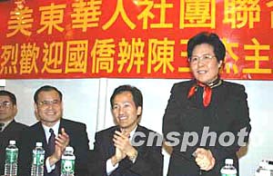 今天早晨,陳玉杰一行七人首先到紐約華埠拜訪美東華人社團聯(lián)合總會,雖然只是臨時會所,但陳玉杰為能親臨僑團感到高興。由于“非典”原因,今年一月出任國僑辦主任的陳玉杰上任十一個月來一直未能到海外與僑胞見面,昨天下午抵達(dá)紐約的陳玉杰每次見到僑胞都為此致歉。如今在海外僑團的會所里,面對親切的僑胞,陳玉杰說自己表個態(tài):將竭盡全力為僑服務(wù)。