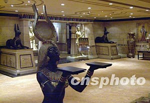 五個貴賓廳總體風(fēng)格設(shè)計(jì)是位于置地三樓的法老王宮殿娛樂場的延伸,但又各有特色。“卡門皇殿”以埃及最富盛名的年輕法老圖坦卡門的皇殿為主題;“佩德拉皇殿”以埃及著名的皇后佩德拉其中一個私人行宮為主題;“大衛(wèi)皇殿”以大衛(wèi)王的私人居室為主題,表現(xiàn)非洲和阿拉伯的情調(diào);“所羅門皇殿”就以羅馬帝國經(jīng)典神殿為主題;“海神皇殿”表現(xiàn)羅馬神話中海神休閑的海底世界。每一貴賓廳的色調(diào)、燈光、壁畫、雕塑都予人出神入化的神秘感覺,令人仿如置身神話宮殿。
