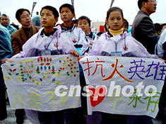 九日上午九時(shí),公安部、湖南省委、省政府在衡陽舉行“撲救衡陽11.3特大火災(zāi)英勇犧牲的革命烈士追悼大會”。中共中央政治局委員、書記處書記、國務(wù)委員兼公安部長周永康參加大會并代表胡錦濤、溫家寶、羅干等向遇難官兵致哀。作者:白祖偕