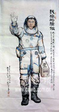 昨日中午,彭老為這幅名為《民族的驕傲》的國畫題字。2米長、1米寬的畫紙上,楊利偉身著白色航天服,右手揮舉,神情生動。