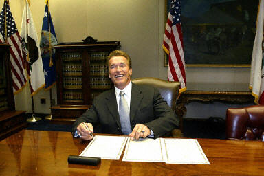 阿諾·施瓦辛格于美國當?shù)貢r間11月17日宣誓就任加利福尼亞州第38任州長。施瓦辛格宣誓就職儀式吸引了大約740名記者參加,規(guī)?氨让绹偨y(tǒng)就職儀式,世界各地數(shù)百萬觀眾觀看了儀式的現(xiàn)場直播。圖為施瓦辛格新官上任首日喜簽首個州長令。
