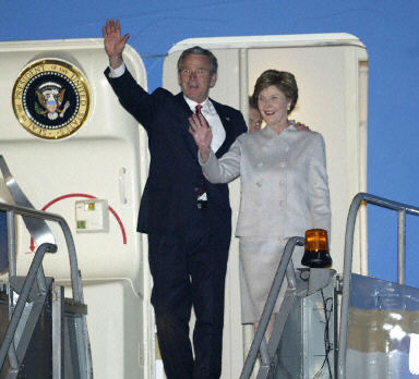 美國總統(tǒng)布什及夫人抵達(dá)倫敦希思羅機(jī)場,步出“空軍一號(hào)”專機(jī),向歡迎人群揮手致意。