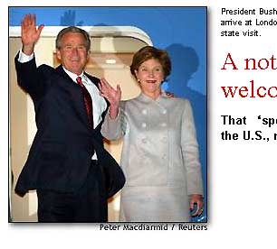 中新網(wǎng)11月19日電美國(guó)國(guó)家廣播公司倫敦報(bào)道,英國(guó)首相上周稱在歐洲正在興起“新的反美主義”,他說對(duì)了,隨著今天布什的來訪,數(shù)千英國(guó)人用言語(yǔ)和行動(dòng)表示對(duì)布什的反對(duì)。