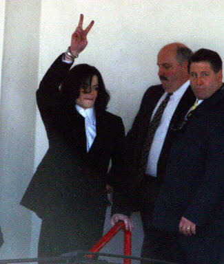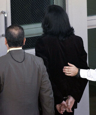 接近美西時間中午時分,邁克爾-杰克遜在雙手被手銬銬住的情況下,由警方和私人律師陪同進(jìn)入圣巴巴拉警察局。