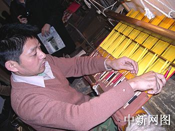 織造南京云錦的老式提花木機,每臺織機須有提花工和織造工兩人配合,前者在上,后者在下,上下協(xié)同生產。兩人勞作一天,僅能織造云錦五厘米長。