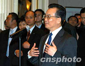 中新社紐約十二月七日電(記者 陳建 趙海燕)中國總理溫家寶于美東時(shí)間七日下午抵達(dá)紐約,開始訪美之行。僅三小時(shí)之后,他就站在數(shù)百名華人面前,充滿感情地吟誦起泰戈?duì)柕脑娋洌簾o論你走得多么遠(yuǎn),你的心總和我連在一起;無論黃昏時(shí)樹的影子有多長,它總是和樹根連在一起。“這正是華僑華人、留學(xué)生和祖國的關(guān)系!贝搜砸怀,掌聲四起。