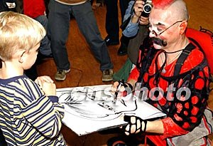 來自俄羅斯的莫斯科馬戲團(tuán)十二月十六日在香港舉行的演出發(fā)布會,在香港一家商場里馬戲團(tuán)小丑為小朋友即興畫像。中新社記者:錢興強(qiáng)